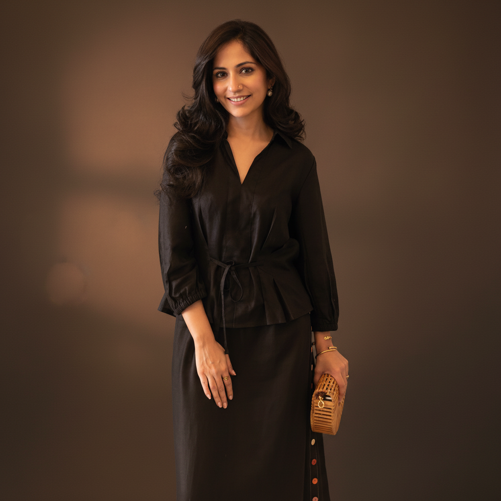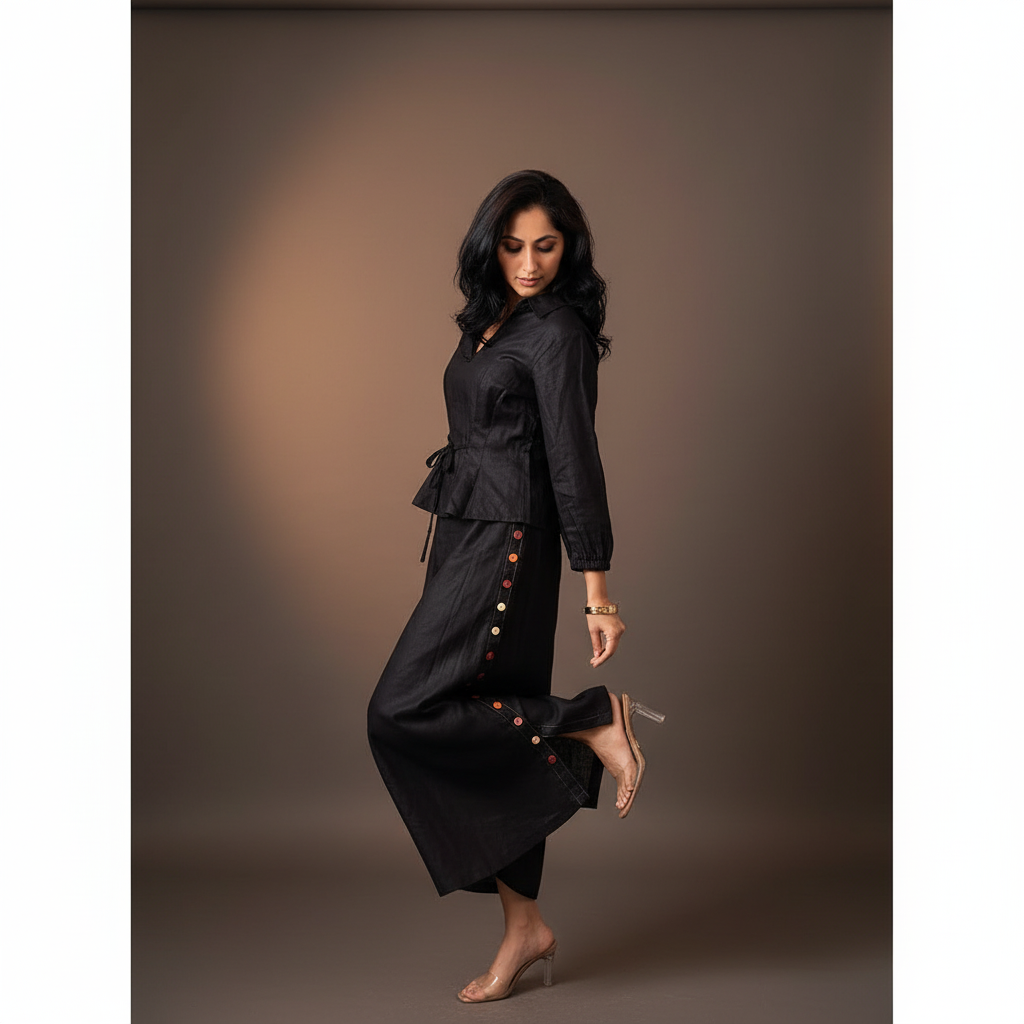 Crafted in fluid black linen, this two-piece set features a softly structured peplum top with a relaxed V-neckline, gentle gathers, and an adjustable waist tie that flatters without restricting movement. The long skirt falls easy and fluid, finished with subtle colour-accented side buttons for a quiet statement.
