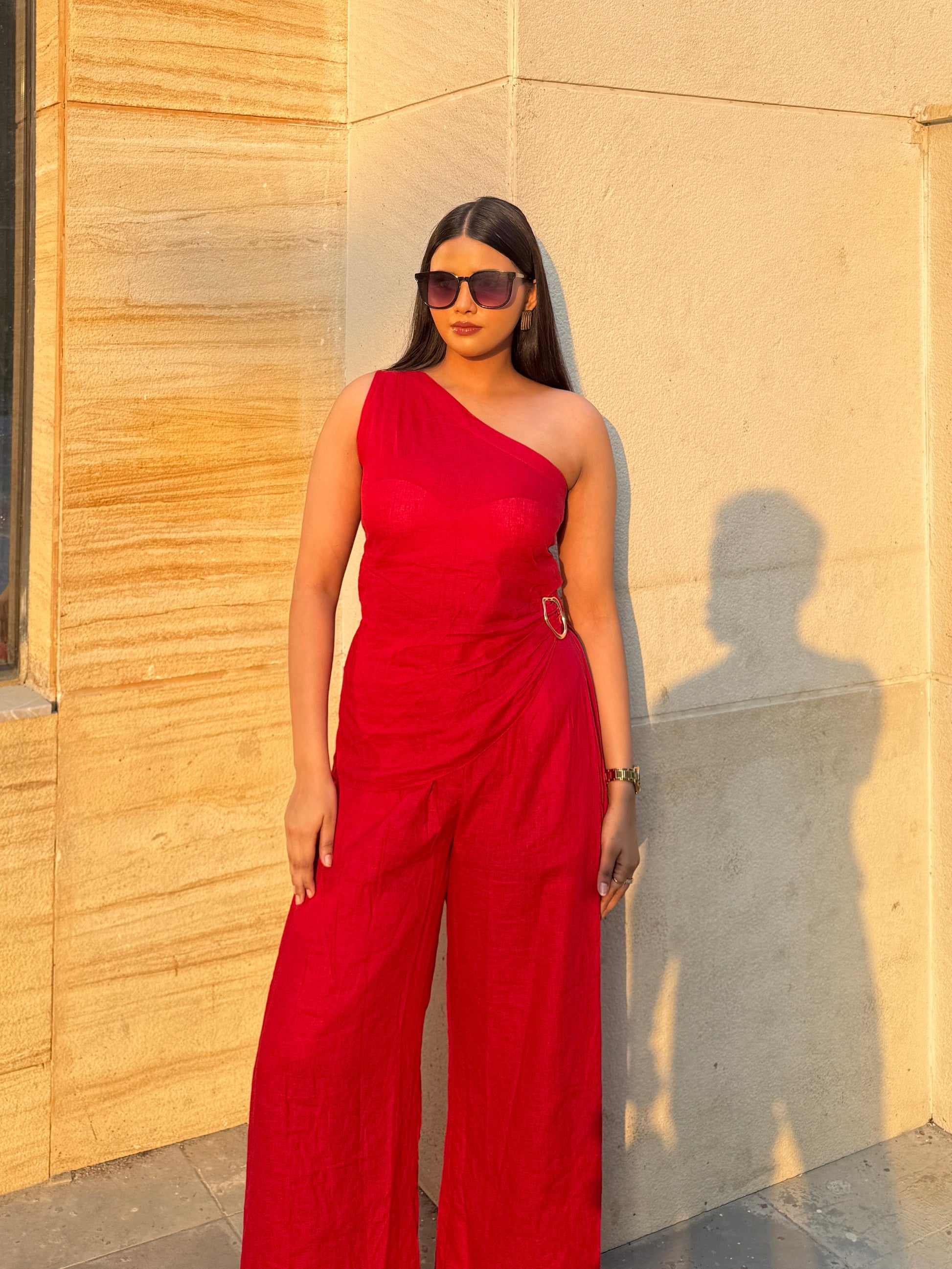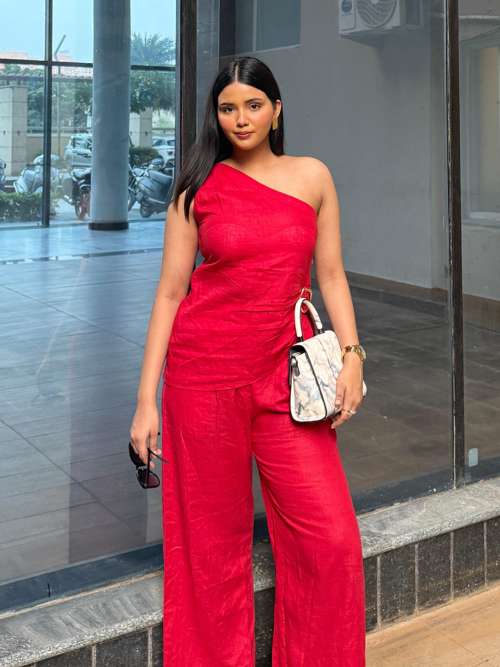 Where minimalism meets quiet luxury — the Vanilla Linen Co-ord Set is crafted in soft, textured linen that drapes beautifully with every move. The one-shoulder top, detailed with a subtle side drape and metallic accent, pairs effortlessly with wide-leg trousers for an easy yet elevated silhouette.