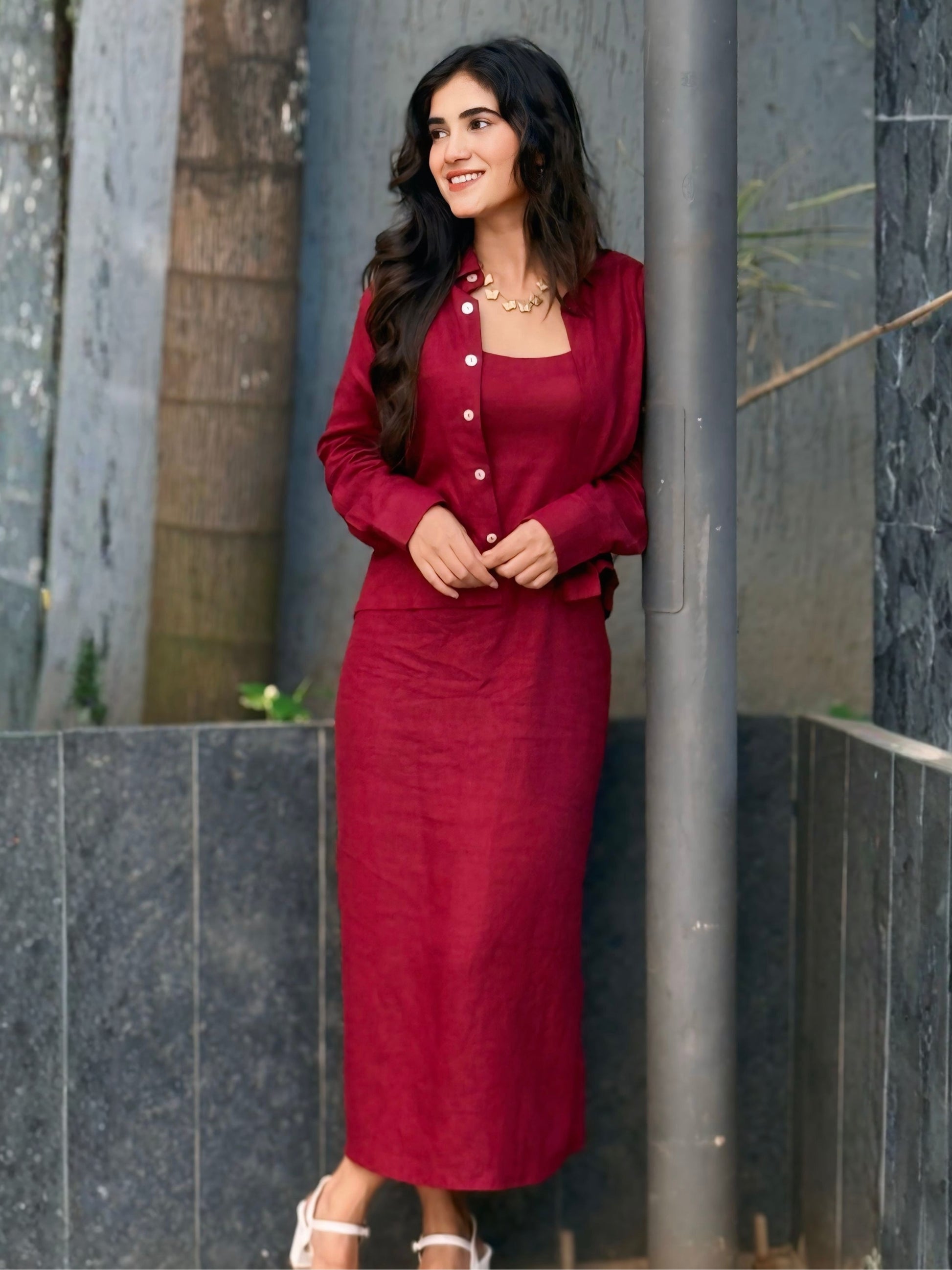 Tailored from deep crimson linen, it features a fitted square-neck dress paired with a structured shirt detailed with pearl-finish buttons. The shirt — part of the set yet designed to stand on its own — can be worn buttoned up, layered open, or styled separately with denims or tailored pants, offering endless versatility with refined ease.